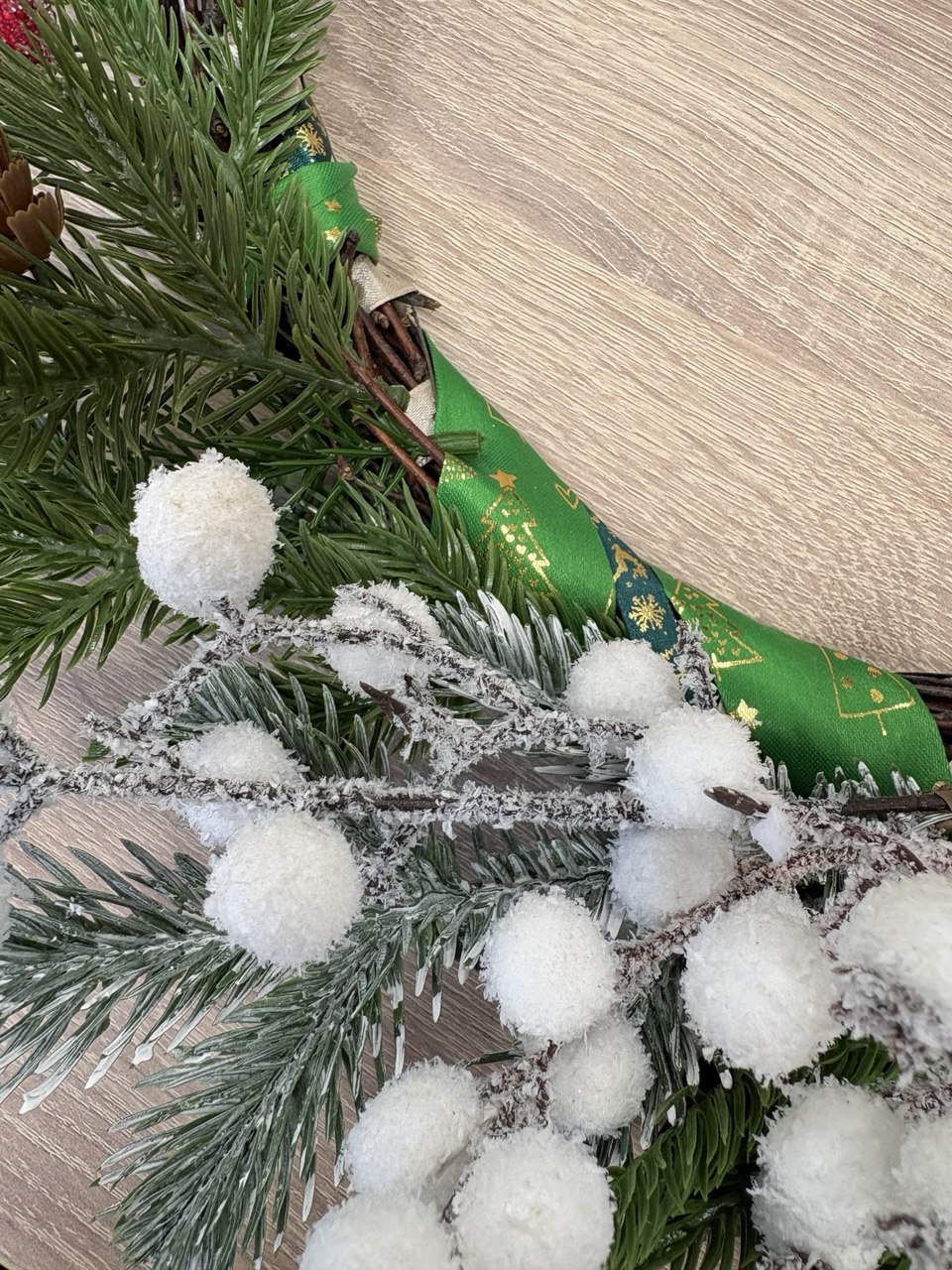 с декором из искусственной ели, с новогодними шарами, лентами, ягодами, керамическими игрушками ручной работы. В завершении возможно декорировать венок искусственным снегом. Все материалы входят в стоимость.
